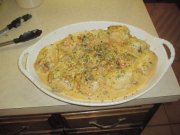 Dave was helping to cook a special recipe -- chicken with crawfish stuffing. He wanted to be in charge of the presentation, and he did such a beautiful job that we had to take a photo. |