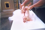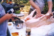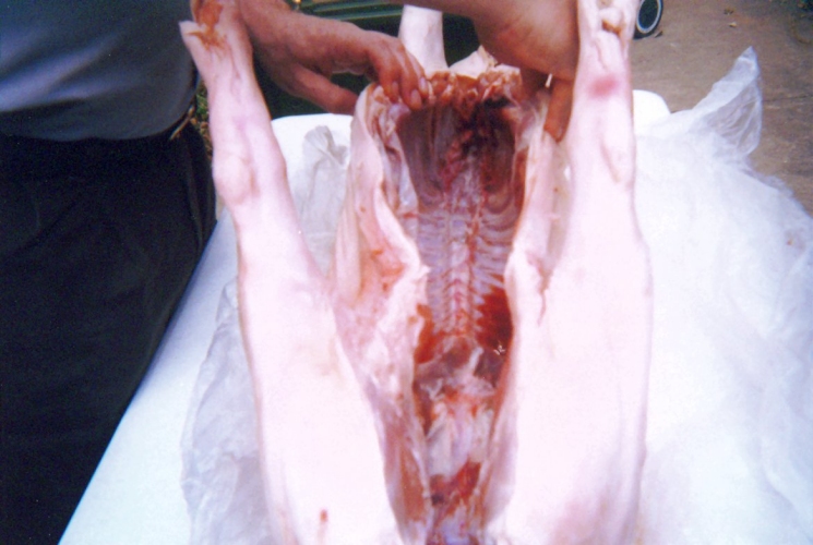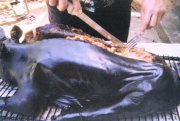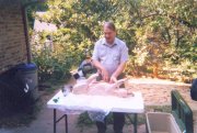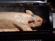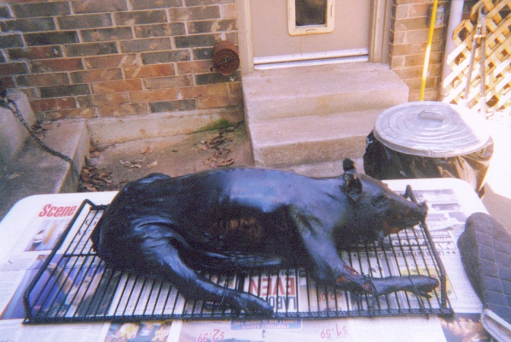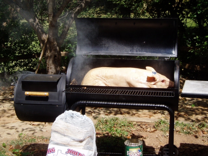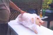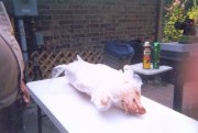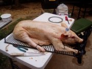 Geof ordered a 25 pound pig, but when he went to pick it up, the butcher said the smallest he had was 34 pounds. |