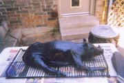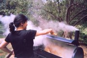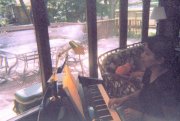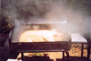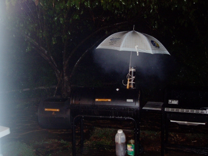Geof got up in the midle of the night to stoke the fire, and found it RAINING! We needed to keep the water out of the chimney, so Geof arranged an umbrella. By the way, smoked umbrella does NOT taste good. |