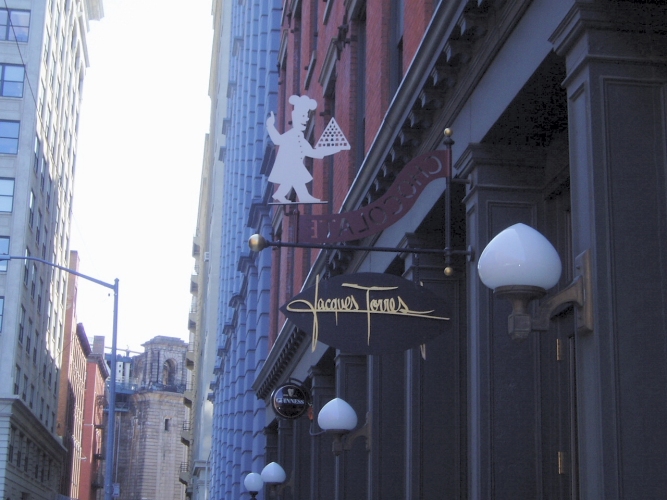 Jacques Torres is a French chocolatier. He has a shop in a new neighborhood in Brooklyn called "DUMBO" -- district under the Manhattan Bridge overpass. Ma and I went to visit the factory and then had a nice lunch in the restuarant down the street.