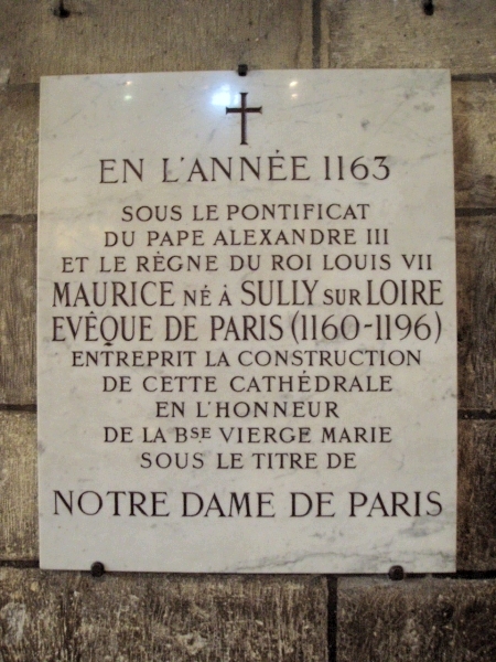 The sign in the cathedral: In the year 1163, under the pontificate of Pope Alexander III and the reign of King Louis VII, Maurice born in Sully on the Loire, Bishop of Paris (1160-1196), undertook the construction of this cathedral in honor of the blessed Virgin Mary, under the title "Notre Dame de Paris".