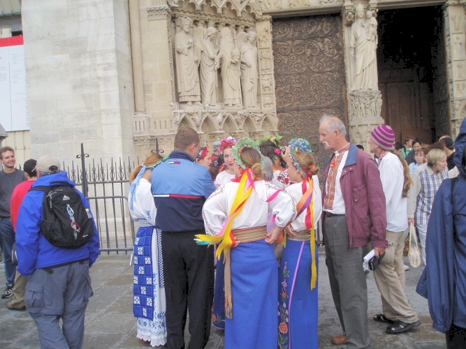 Later that evening, we were meeting Vlado's friends for dinner. We agreed to meet at Notre Dame. While we were waiting, a group of dancers in brightly colored costumes were there.