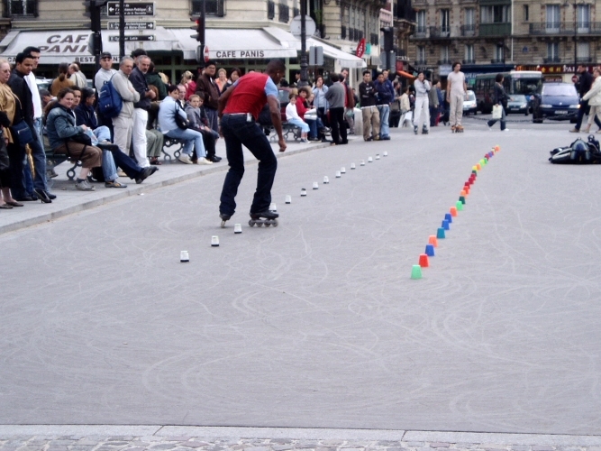 There were roller bladers exhibiting their skills. They would skate backwards intricately weaving their feet around the cups.