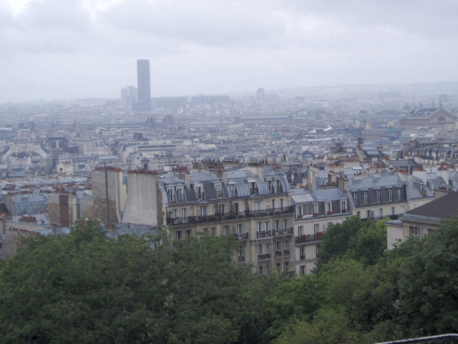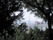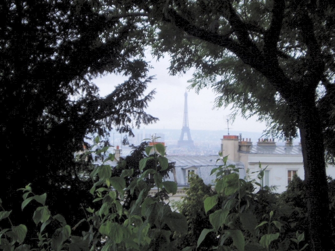From one particular spot in the park by Sacré Coeur, you can see the Eiffel Tower through the trees.