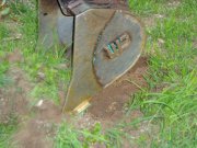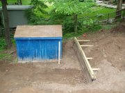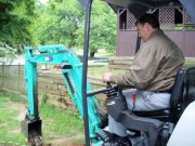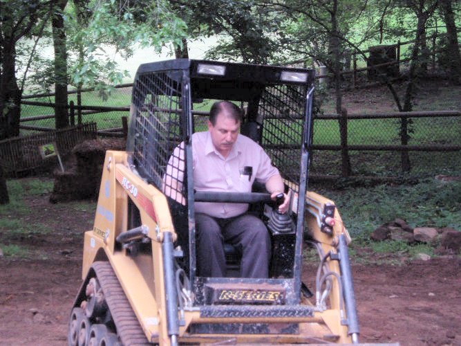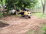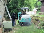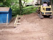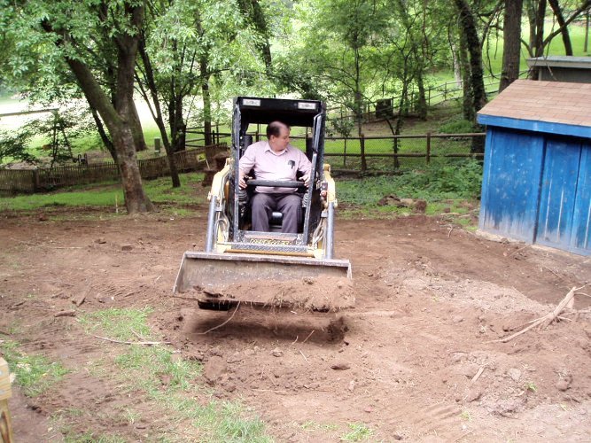 After digging the face of the wall and putting up railroad ties, Geof needed to move the dirt up the hill, so he rented a scooper.
