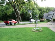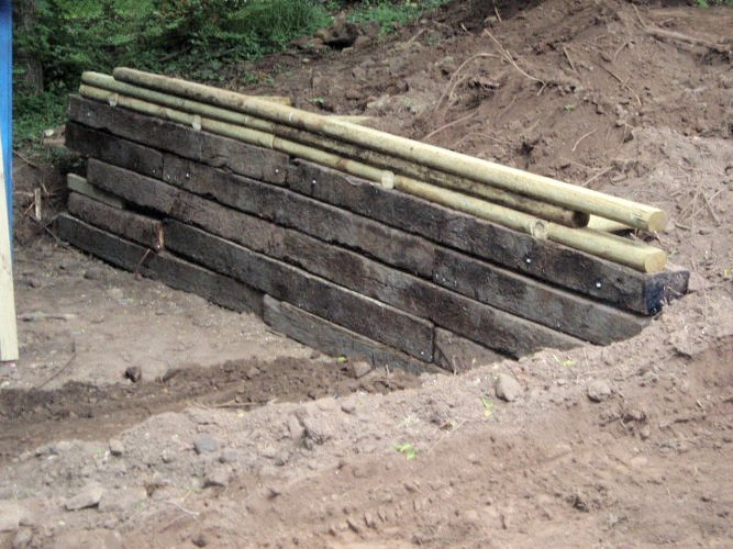 Here's a view of the wall nearly complete. We enventually took the landscaping timbers off the top and added some more rows of railroad ties.