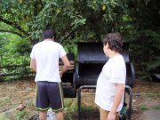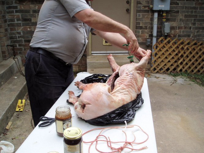 Now he's almost ready for the smoker. We wire his legs to the grill so he can't slip off while putting him in or turning him.