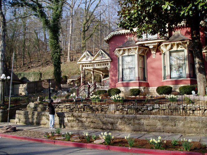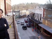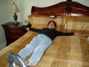 Judy and Geof drove about 4 hours east into Arkansas to a small tourist town, Eureka Springs, which is a lovely spot in the Ozarks. Judy sees if the bed in our hotel room is big enough for her. |
