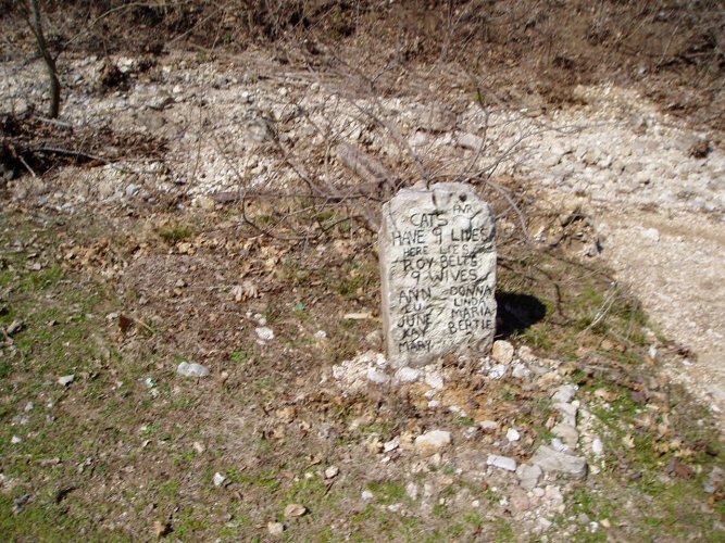 The sign along the trail reads: "Cats have nine lives. Here lies Roy Belts. Nine wives. Ann Donna Lu Linda June Maria Kay Bertie Mary". |