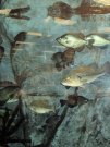 A huge aquarium with game fish. The bass must weigh 5 or 6 pounds. |