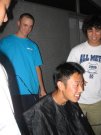 Gregg (blue) and I are giving James (seated) a mohawk. He asked for it. |