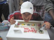 Sue Ann (blue), Kirk (red) and Jason (on the right) at James' birthday party. |