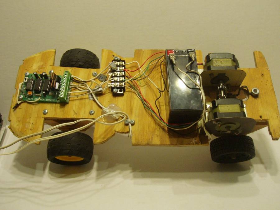 This is the inside of the truck with the body off. The car runs with a pair of stepper motors. The object of the competition is to design your car so that you can predict exactly how far it will go based upon the conditions you apply. In Joey's case, the strength of the acid determines how fast the magnesium is dissolved, and therefore, how far the car will go. |