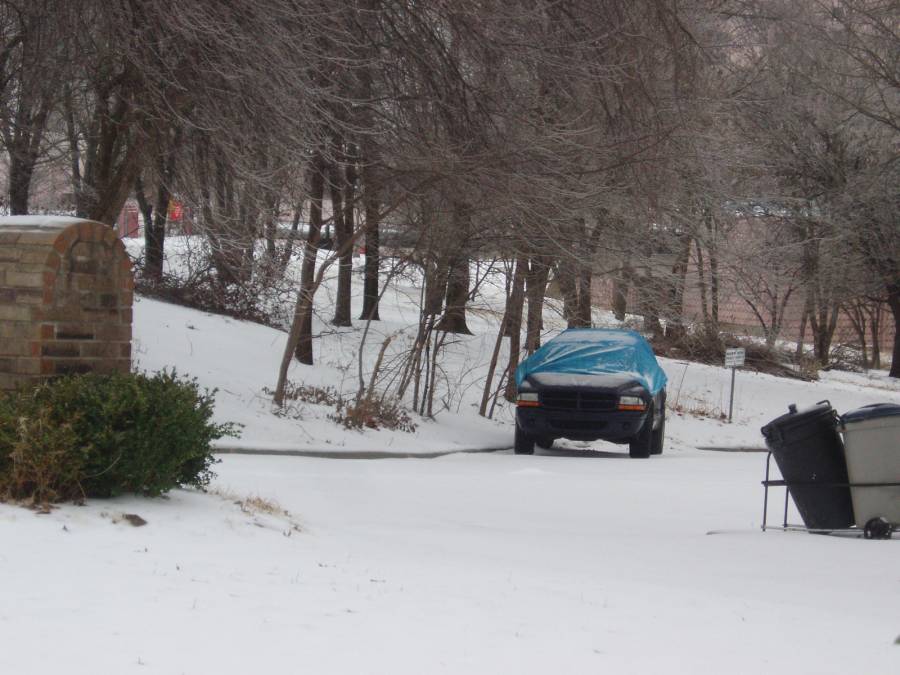 We knew the storm was coming, and that Judy's car wouldn't be much good since it has two-wheel-drive and our two trucks are four-wheel-drive, so we had covered the car and put it in the cul-de-sac. |
