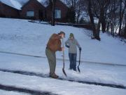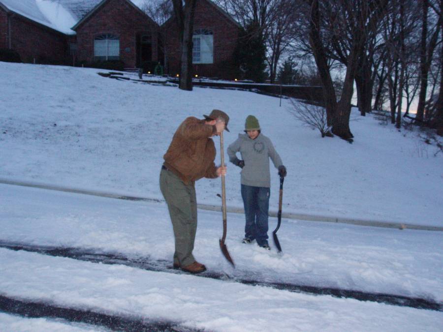 Chipping up ice in the street to help us get up the hill. We used to shovel the entire street before we had 4 wheel drive vehicles. |