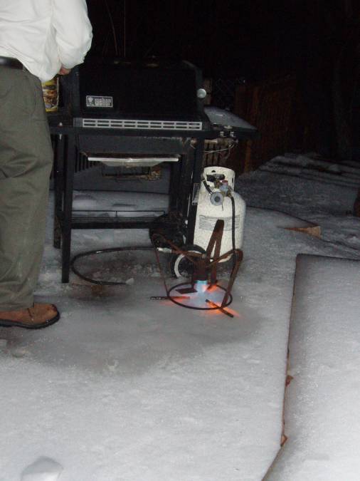 Geof tried to use the propane crawfish boiler turned upside-down to melt some of the ice on the back porch. It was fun, but didn't work that great. |