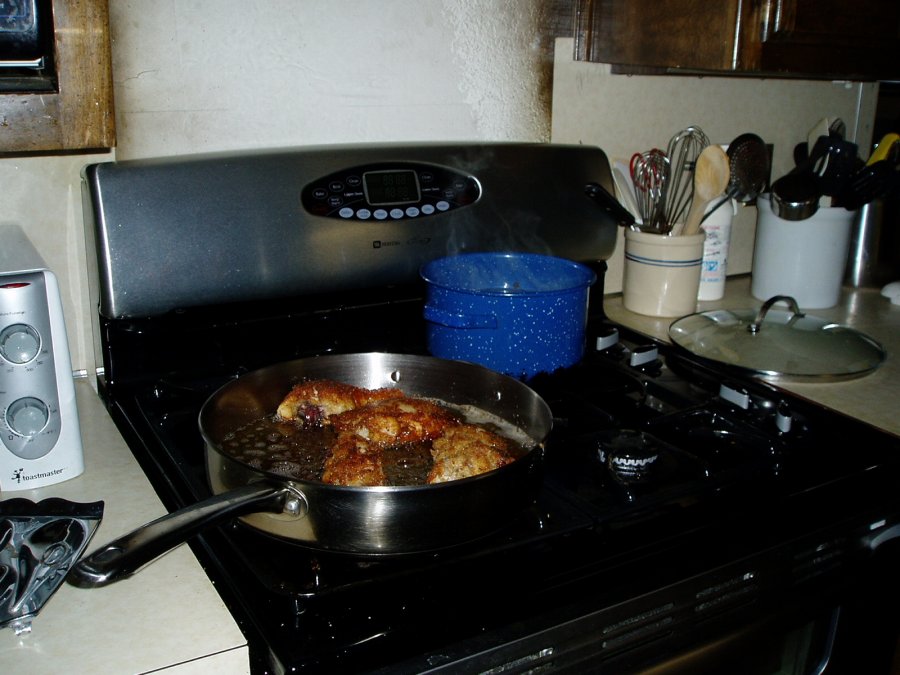Fortunately, we also have a gas stove, so Judy could cook. Here, she is frying chicken and making mashed potatoes. Quite a treat! |