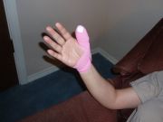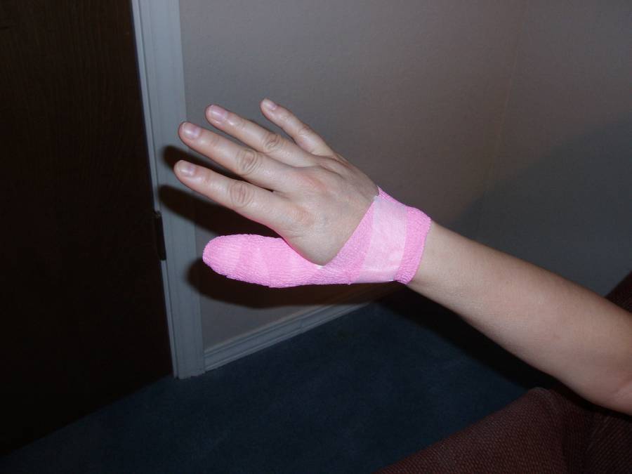 Judy had a cyst in her thumb and had surgery to have it removed. Tough to type with this thing. |
