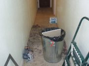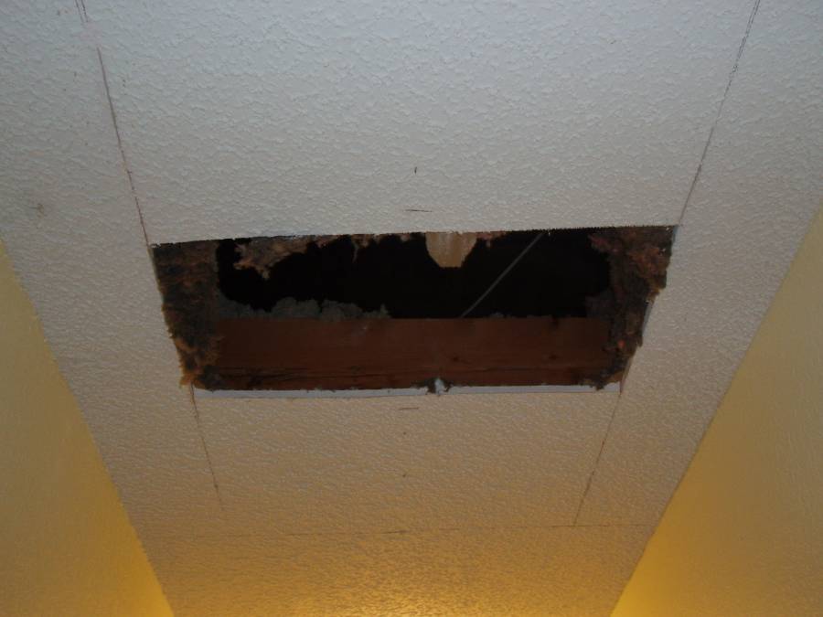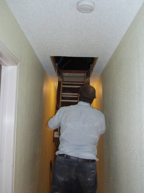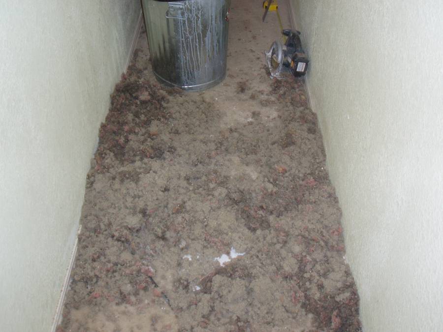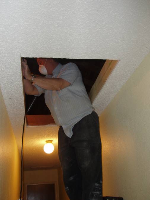 Although Geof tried to catch it, the attic insulation fell into the hallway. What a mess! |