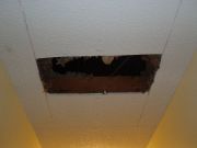 Geof decided to add stairs and flooring into the attic space above the second floor hallway. Here is the first cut out of the ceiling. |