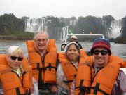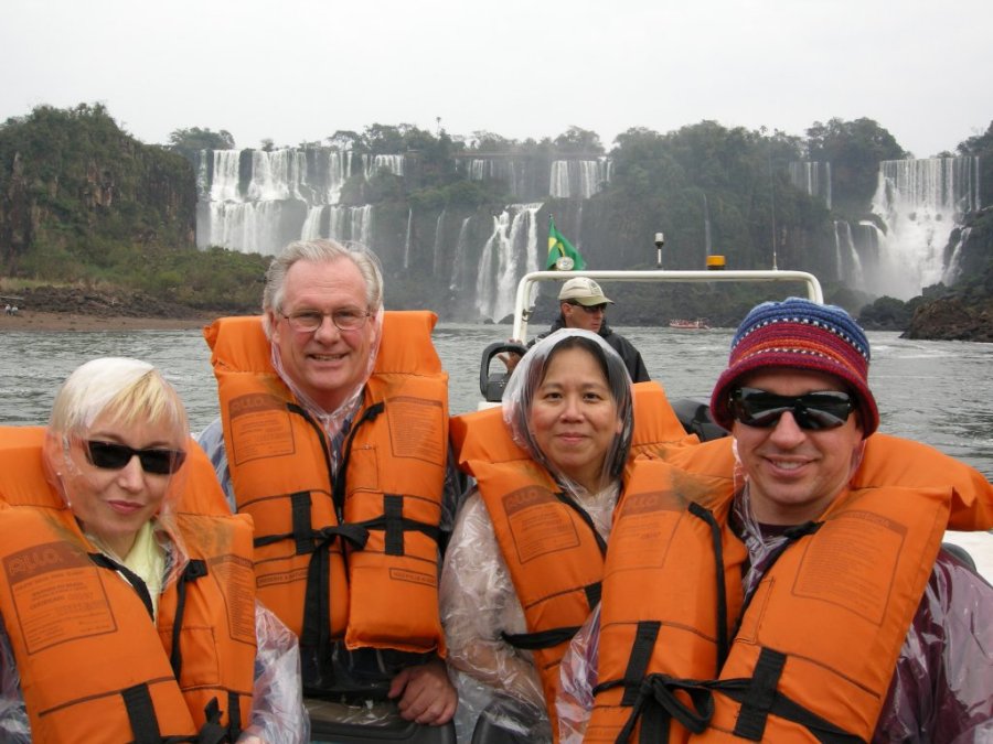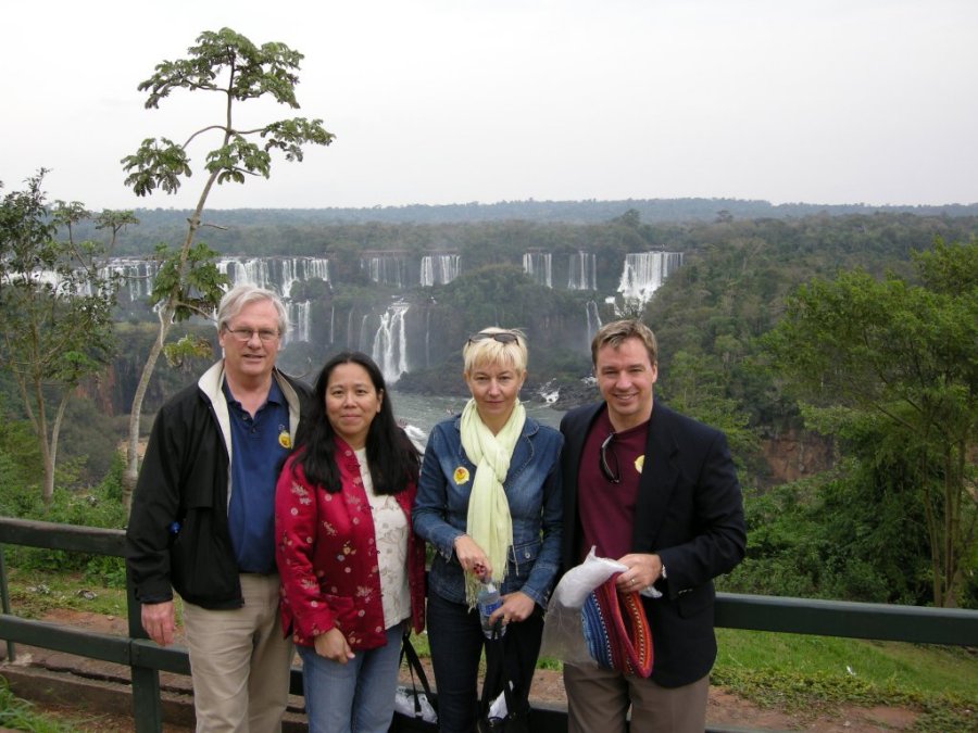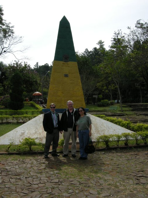 The MB team. We left Asuncion a day early and flew to Cuidad del Este, on the eastern border of Paraguay. We took a van into Brazil and stayed near the waterfalls of Iguacu (Foz do Iguacu). We had gotten up at 3:30 AM for this trip. It looks like my hand in the air, but it's really Jimbo's. See his hat? It is his famous Iquique hat that he loves. |