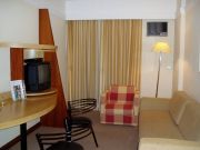 This was my room in Brasilia. This was the living room. Behind the curtain was a balcony. No wi-fi, but they provided a patch cord for broadband. I couldn't reach the AC to figure out how to control the temperature. |