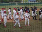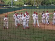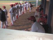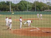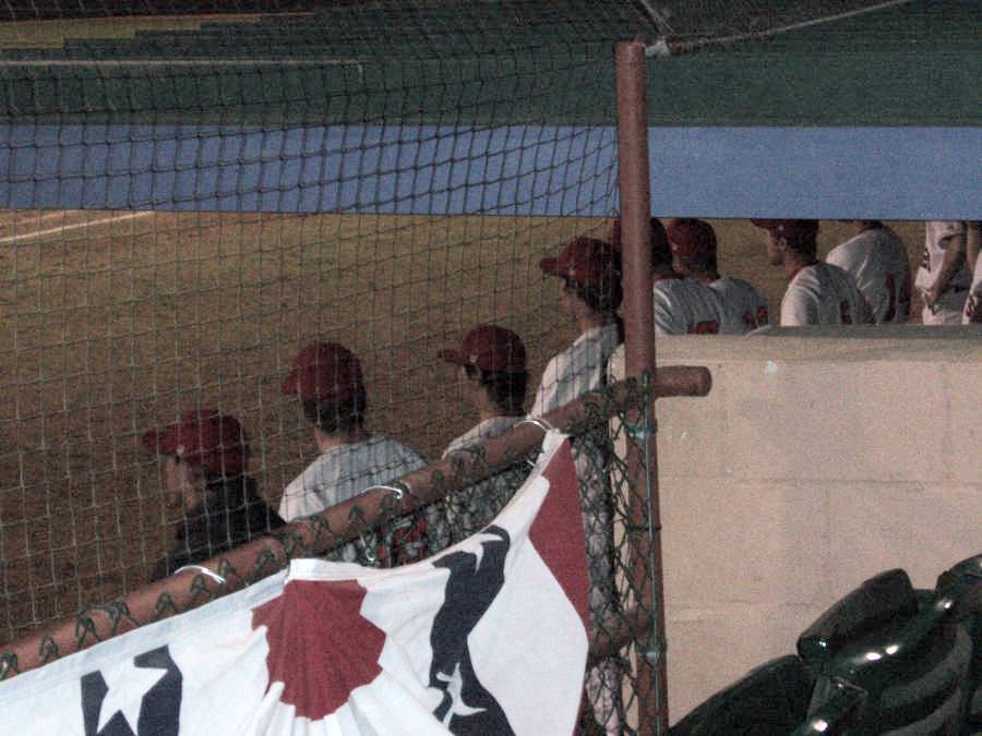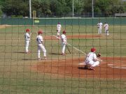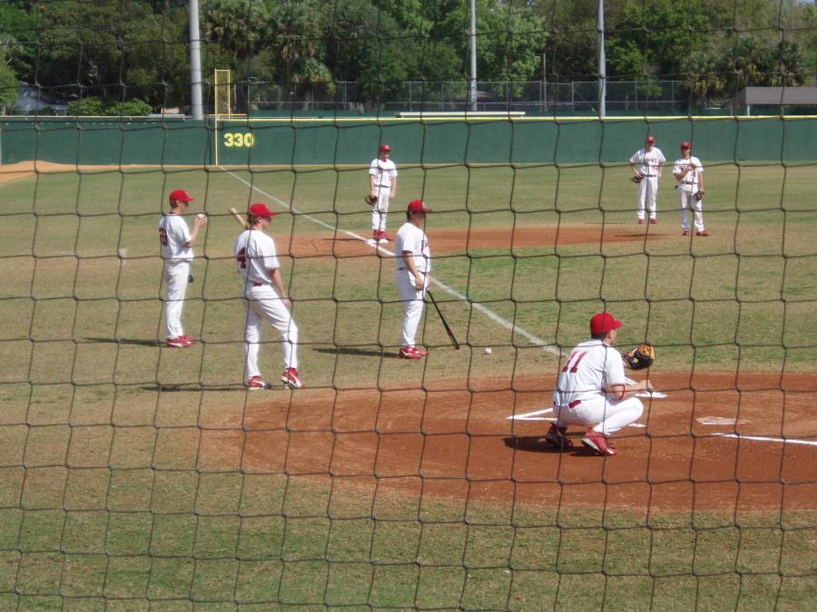 The WashU baseball team always goes to Florida during Spring Break to play in a tournament. Geof decided to meet go and watch the team. Here, Jerry sits and keeps score while most of the team stands and watches. |
