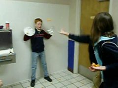 Here's where we were doing an activity in the hallway -- tossing cheetos toward plates covered with shaving cream. Now I can't even remember what the lesson was! |