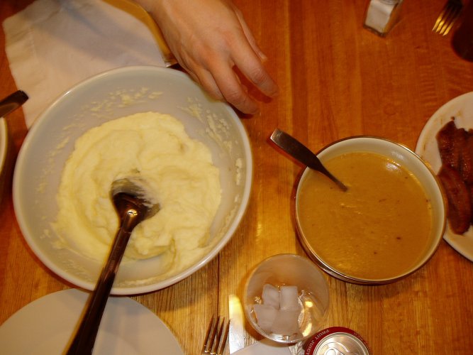 A few mashed potatoes, gravy, and we are set for a great dinner. Canadian geese are tasty.