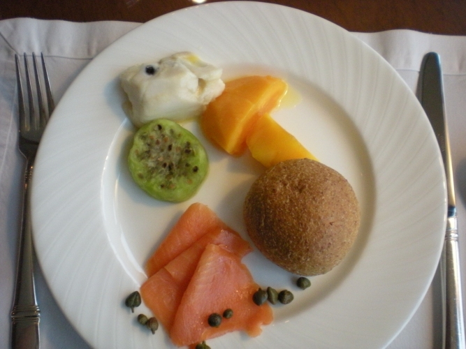 At breakfast, there was always smoked salmon. Judy thinks this is the height of luxury. There were also strange fruit that Judy had never seen before -- the white fruit on the top of the plate is called "Chirimoya". It has gigantic black seeds that look like eyes. The green fruit is called "Tuna". It is the fruit of the pricly pear cactus.