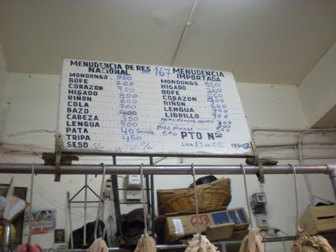 Near the plaza was a market. I walked through and immediately found this area selling offal. Menudencia = entrails. I didn't take a photo of the goods, but I took this photo of the sign. Mondongo = stomach; bofe = lung; corazon = heart; higado = liver; rinon = kidney; cola = tail; bazo = spleen; cabeza = head; lengua = tongue; pata = leg; tripa = gut; seso = brain.