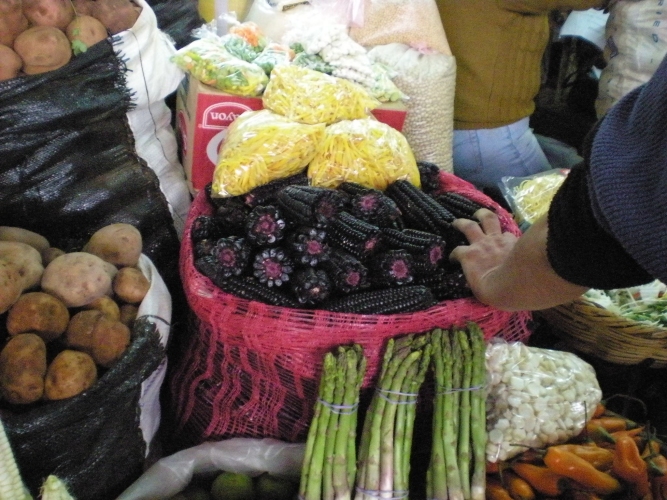 There were fruits and veggies that we don't have in the states. They have this purple corn. In Peru, they make a drink out of it called "Chicha morada". It is sweet and unfermented, although I think there is also a fermented drink made from this maize morada.